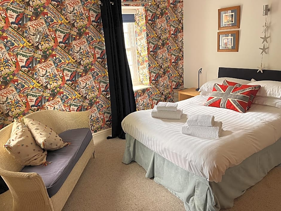 This a 1st floor room with a king-sized half tester bed, bay windows the full width of the room and an private bathroom.